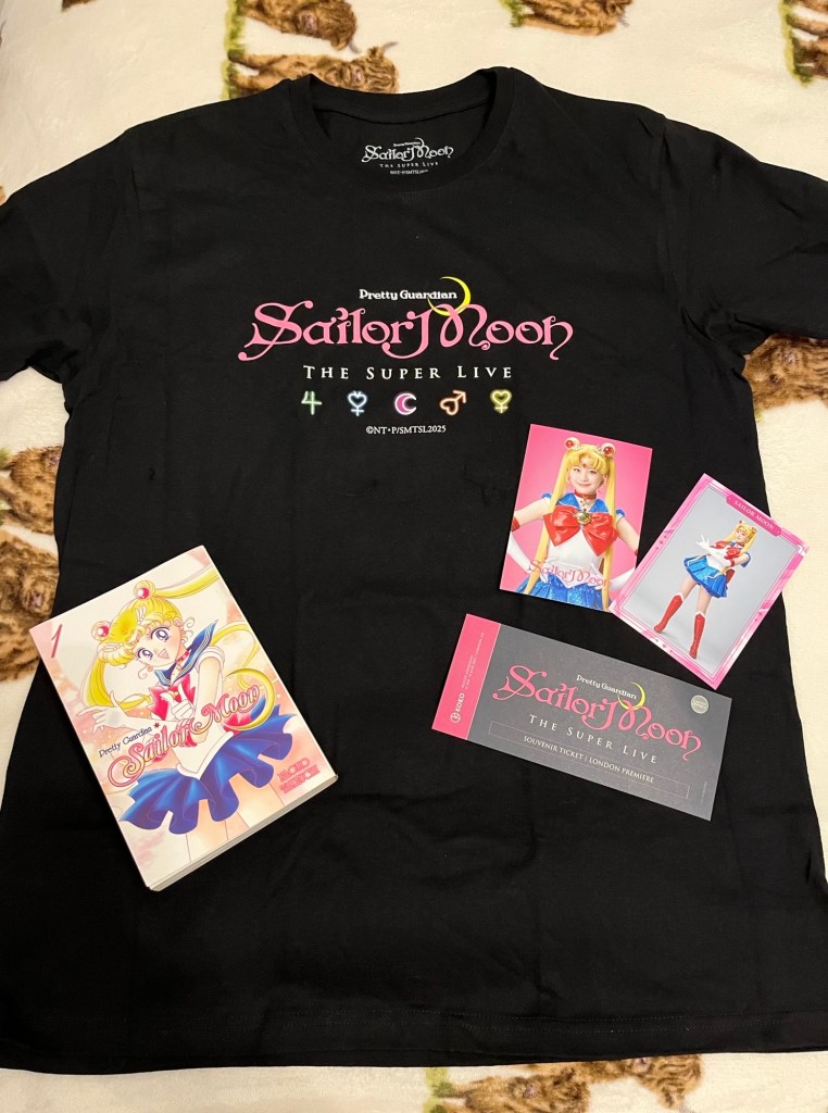 This is my merch that I got (Other than the Manga book/ comic I just took that with me for the train ride) But I got an awesome T-shirt, two postcards of my favourite ‘Sailor Moon’ and a V.I.P collectors edition ticket. I do also have a poster but that’s on the walls of my study, along with my Japanese ladies and cups that my family brought me back when they had a trip to Japan.