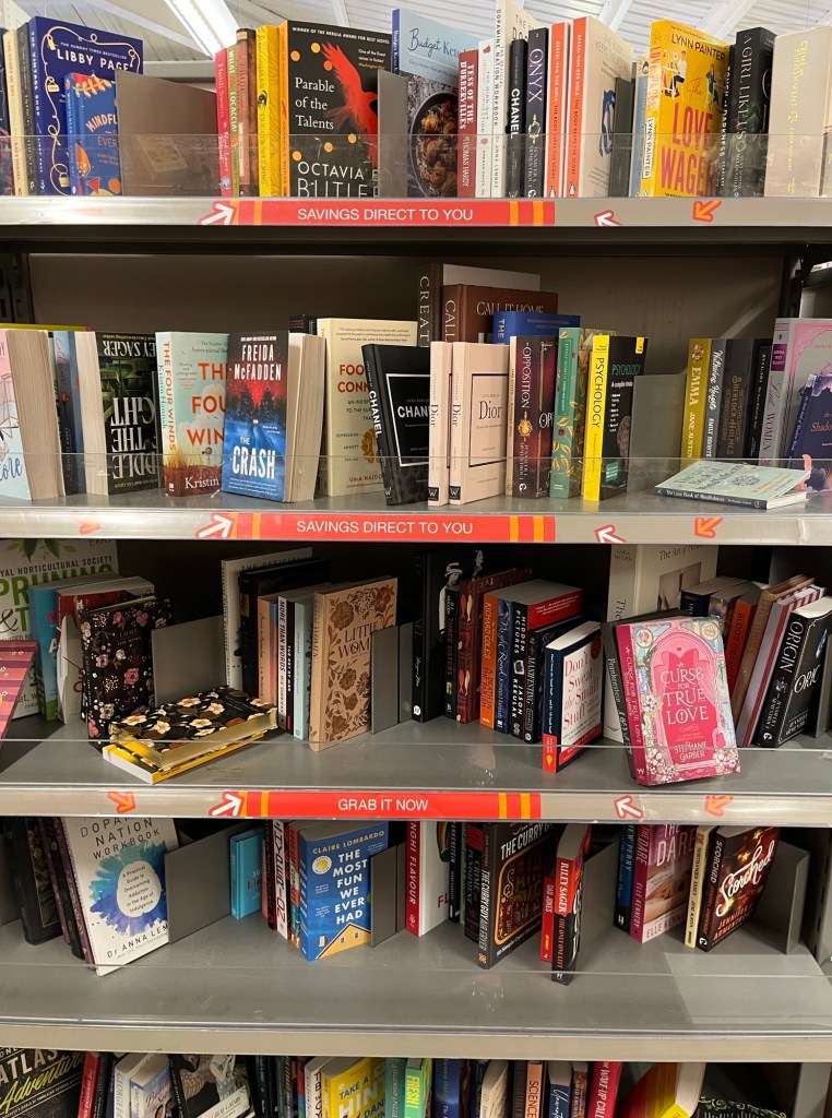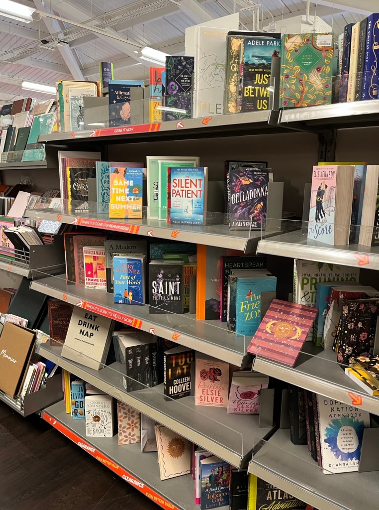 Don’t laugh, the image above is an AI image of ‘T K MAXX’, because I was too embarrassed to stand outside the store and take a photo of the actual shop itself (I didn’t want to look like some crazy lady) Inside it wasn’t so bad to sneak a photo or two of the books because it was just me at the time looking at them, but outside was a huge car park filled with shoppers… So yeah, I decided to cheat and use an AI image.