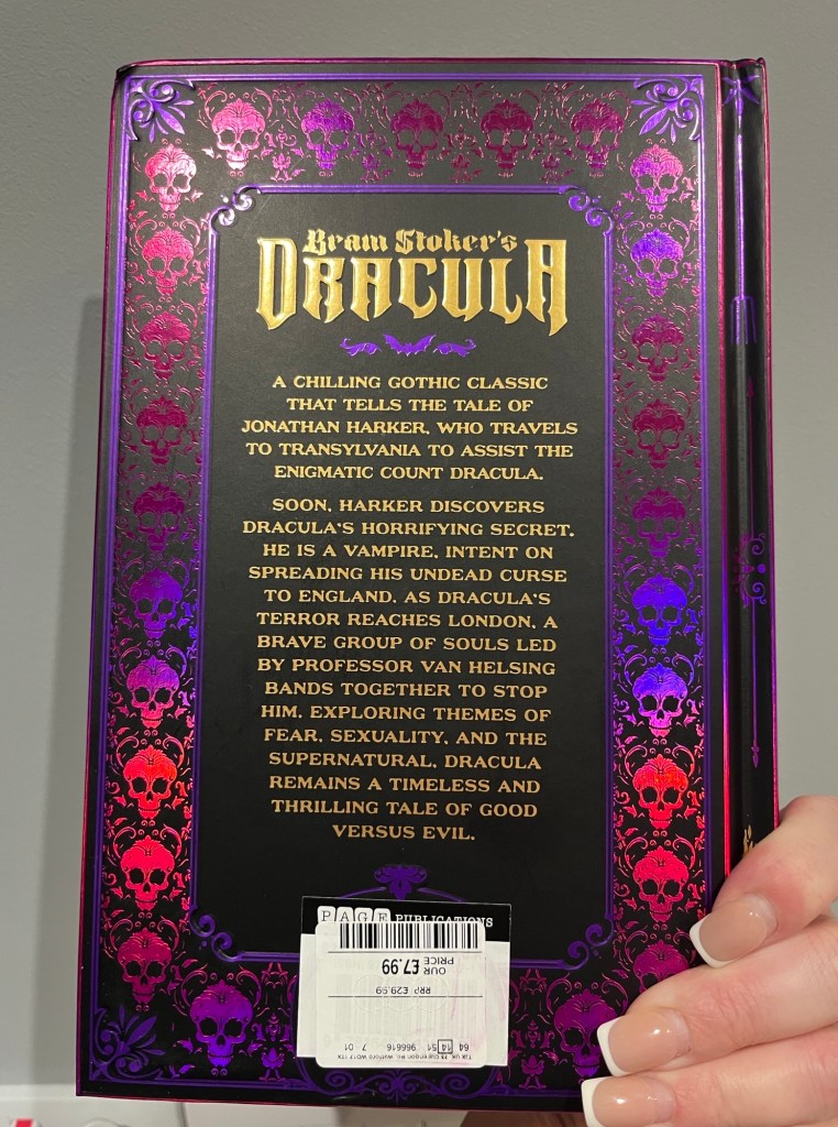 Dracula by Bram Stoker… A legendary classic in itself but… Just look at this edition!!! The cover design has been embossed so certain spiral like patterns are textured, the title is raised… But what really got me was the colour, the pretty vibrant purple hues that shine almost neon and metallic in the light. The book is also hard cover and feels solid and immaculate.
