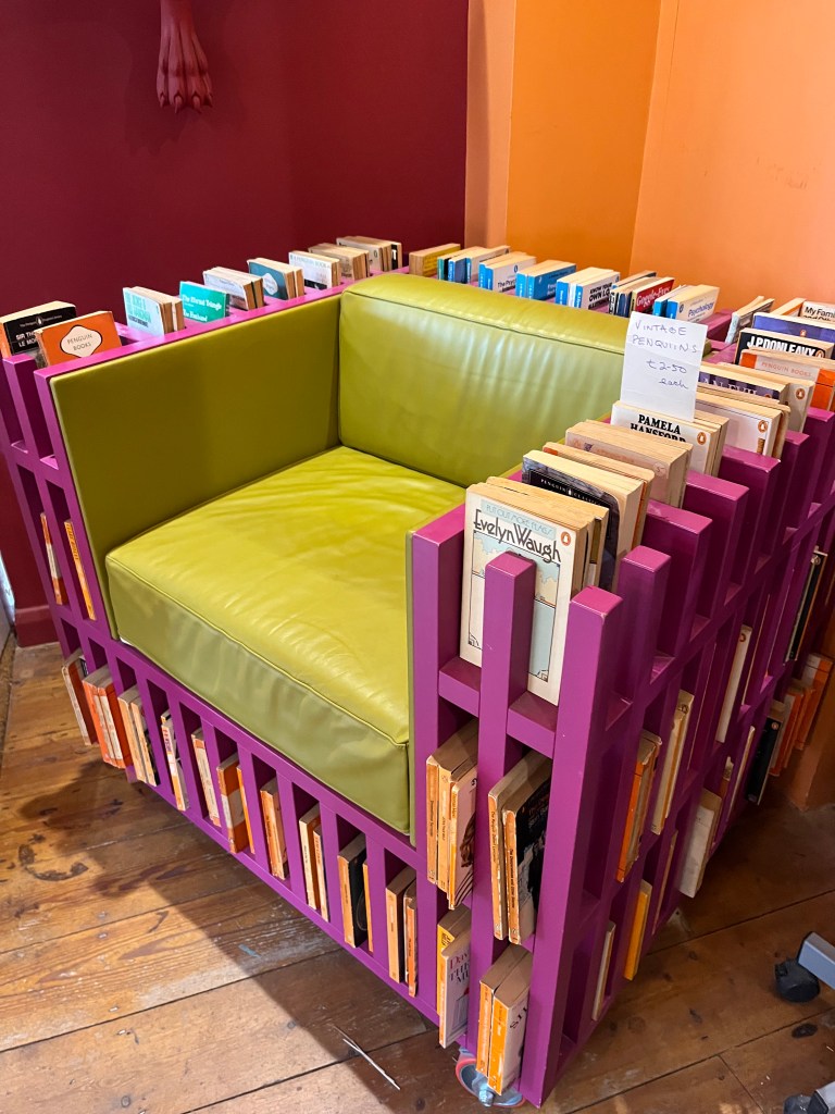 Downstairs begins with a chair that seconds as a bookcase, it has a perfectly formed seat for the buttocks of an avid reader, and then along the sides and back is a dedicated bookcase that holds many books. It being brightly decorated with pink and lime green means it sticks out but in a good way and the décor of the shop itself is quirky, colourful and unique.